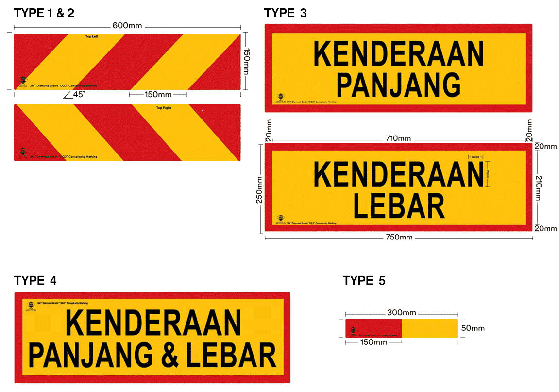 3M™ Malaysia's Traffic Safety & Security Division is a core contributor to the Malaysian government's efforts to introduce and implement road safety standards for heavy vehicle marking. 3M™ Traffic Safety & Security Division is working with PUSPAKOM and JPJ to make the standard a reality for the betterment of road safety in Malaysia by ensuring that the following marking types can be found on all heavy vehicles in the country.